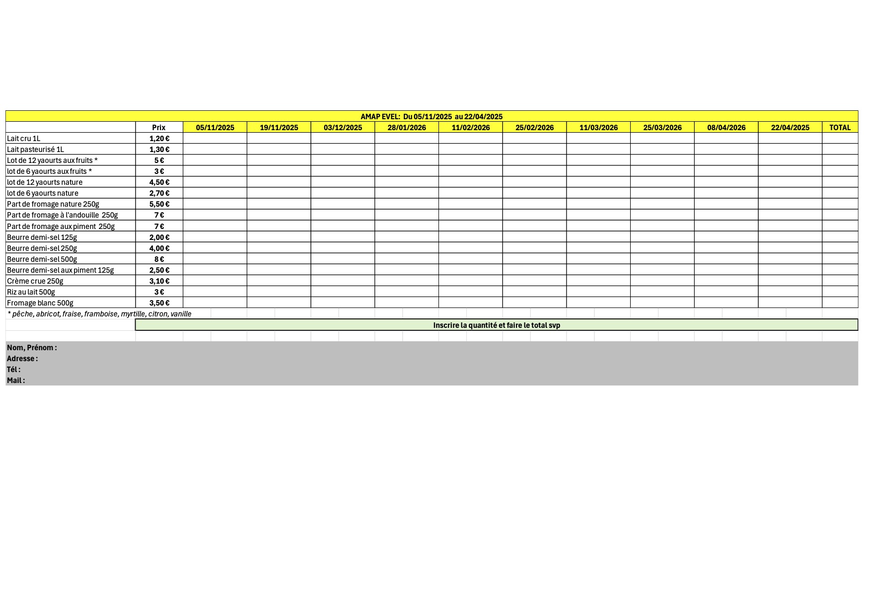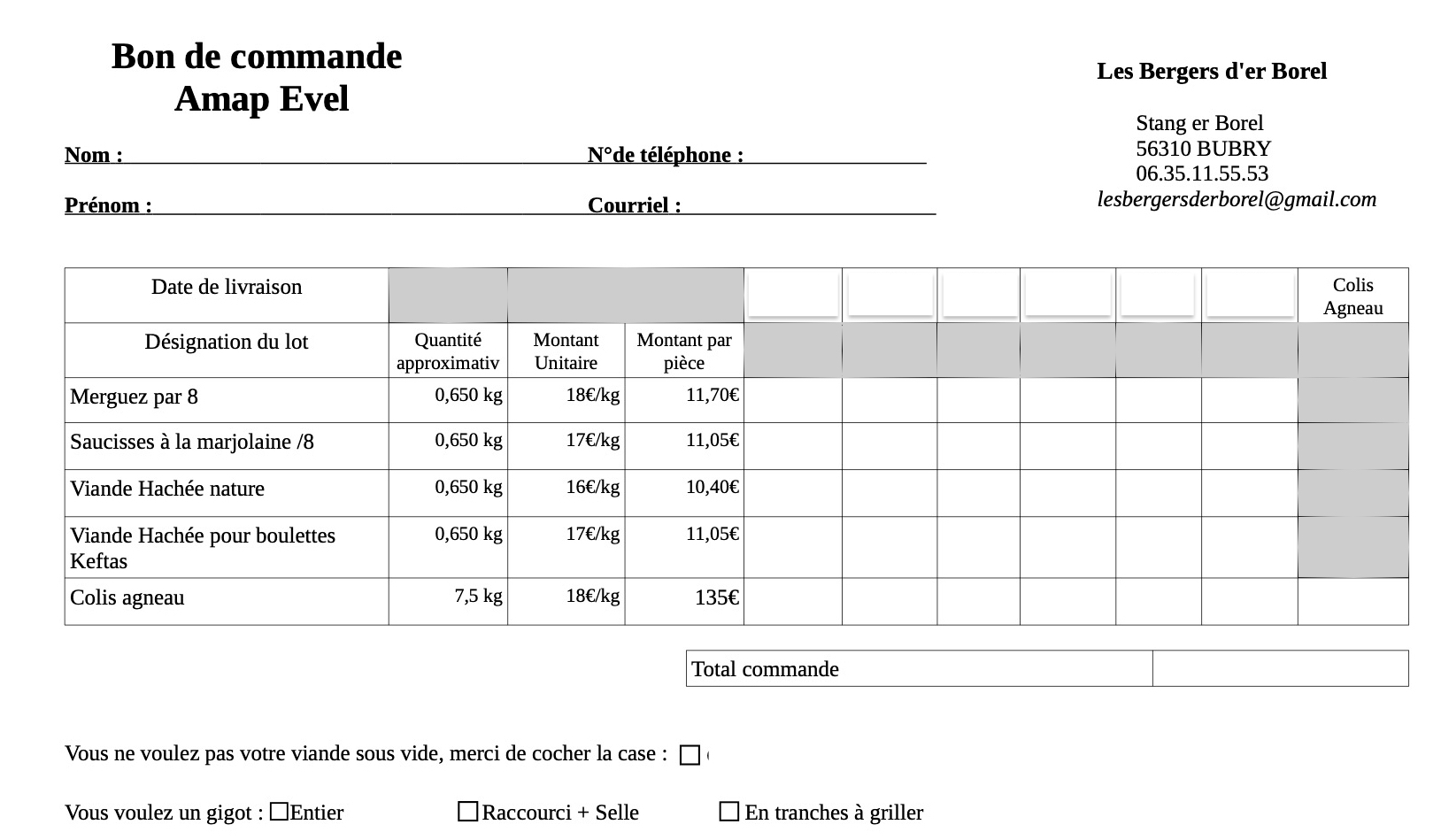 Livraison les mercredi de distribution à la demande sur simple appel.