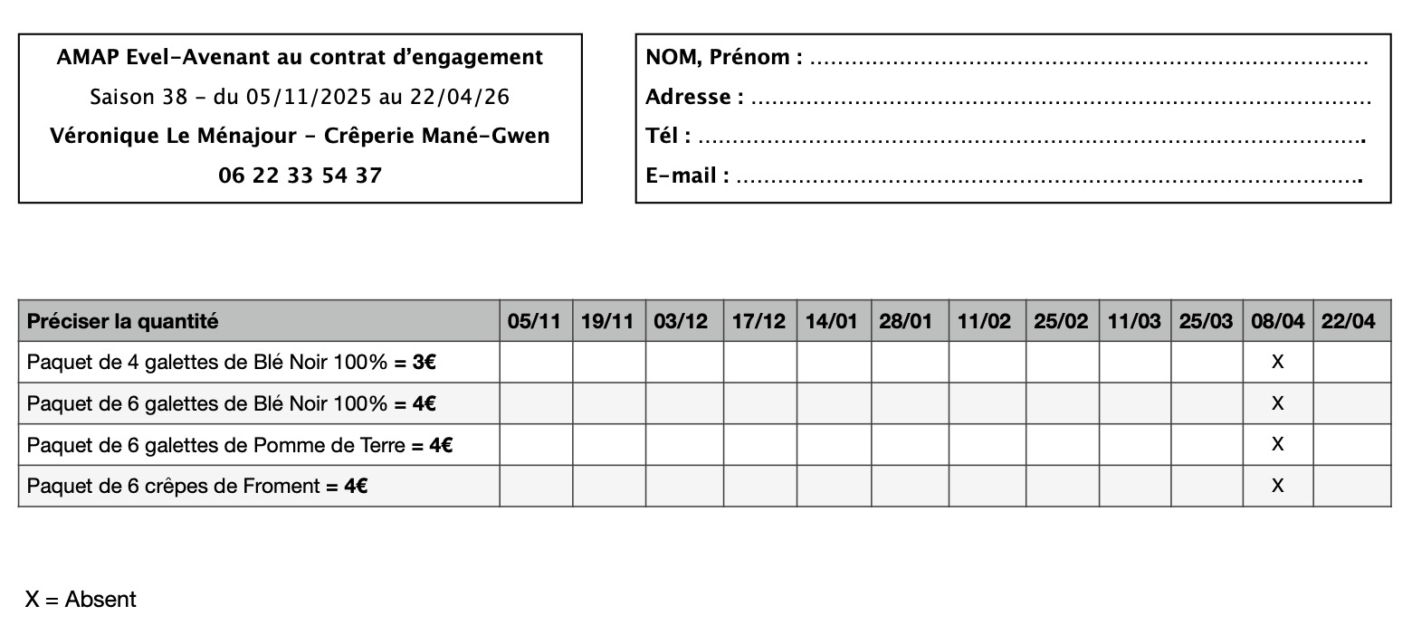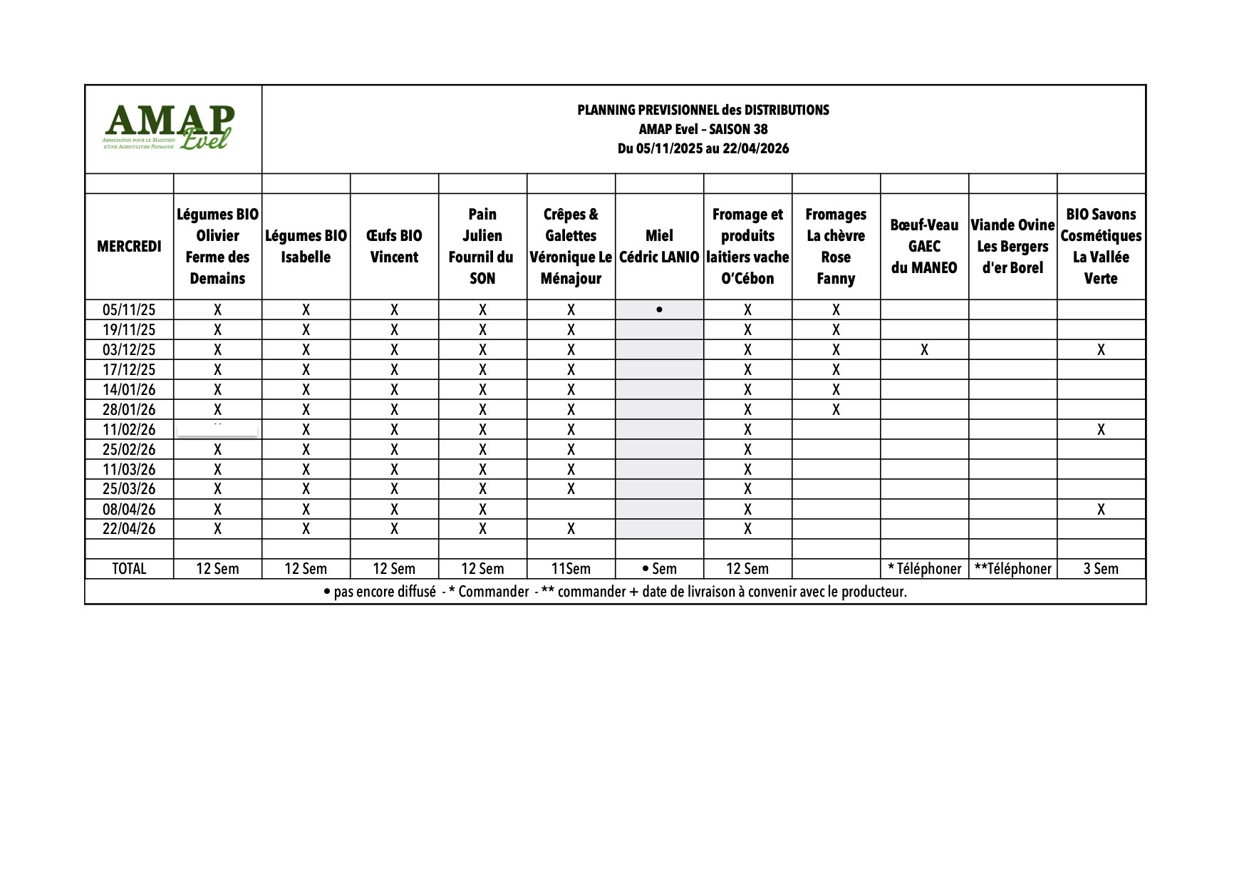 Par manque de commandes aucune date de distribution n’est diffusée cette saison. Contacter directement le producteur pour obtenir une livraison un mercredi du planning.